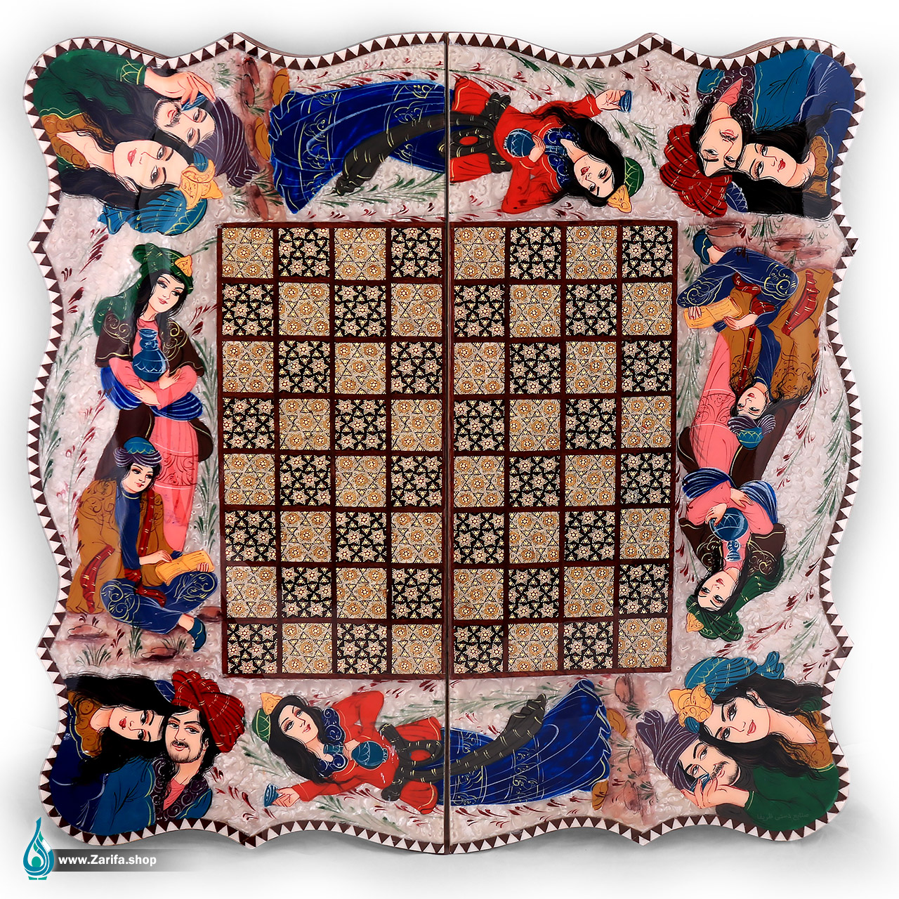 تخته نرد خاتم دالبری زمینه صدف با نگارگری لیلی و مجنون 50 در 50