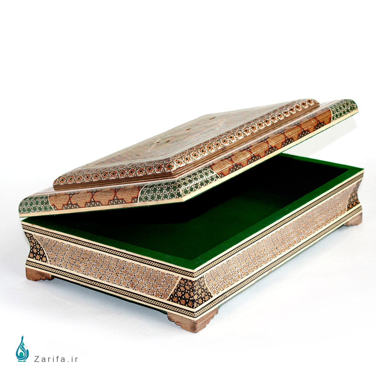 جا قرآنی خاتم کاری کیفیت اعلا یا اصطلاحا جعبه قرآن خاتم در تزیین خانه و مکان های رسمی نیز کاربرد دارد. هم چنین در صورتی که بین اهدای هدیه و عدم اهدای آن تردید دارید، قرار دادن گواهی نامه، تقدیرنامه یا لوحی رسمی و یا صمیمانه در این جعبه، سبب می شود که هم هدیه ای زیبا ارائه داده باشید هم توجه دریافت کننده آن به لوح یا گواهی مدنظرتان بیشتر می شود و ارزش آن را بهتر در می یابد.