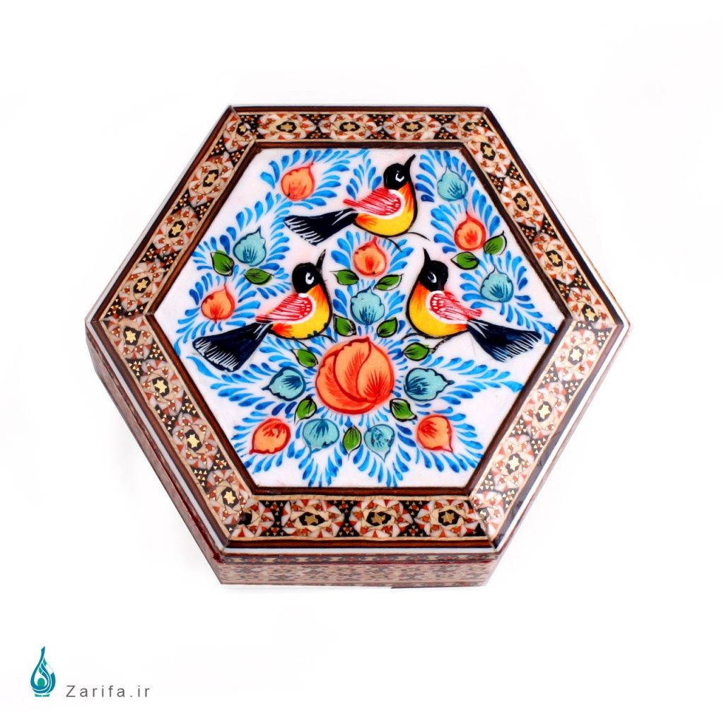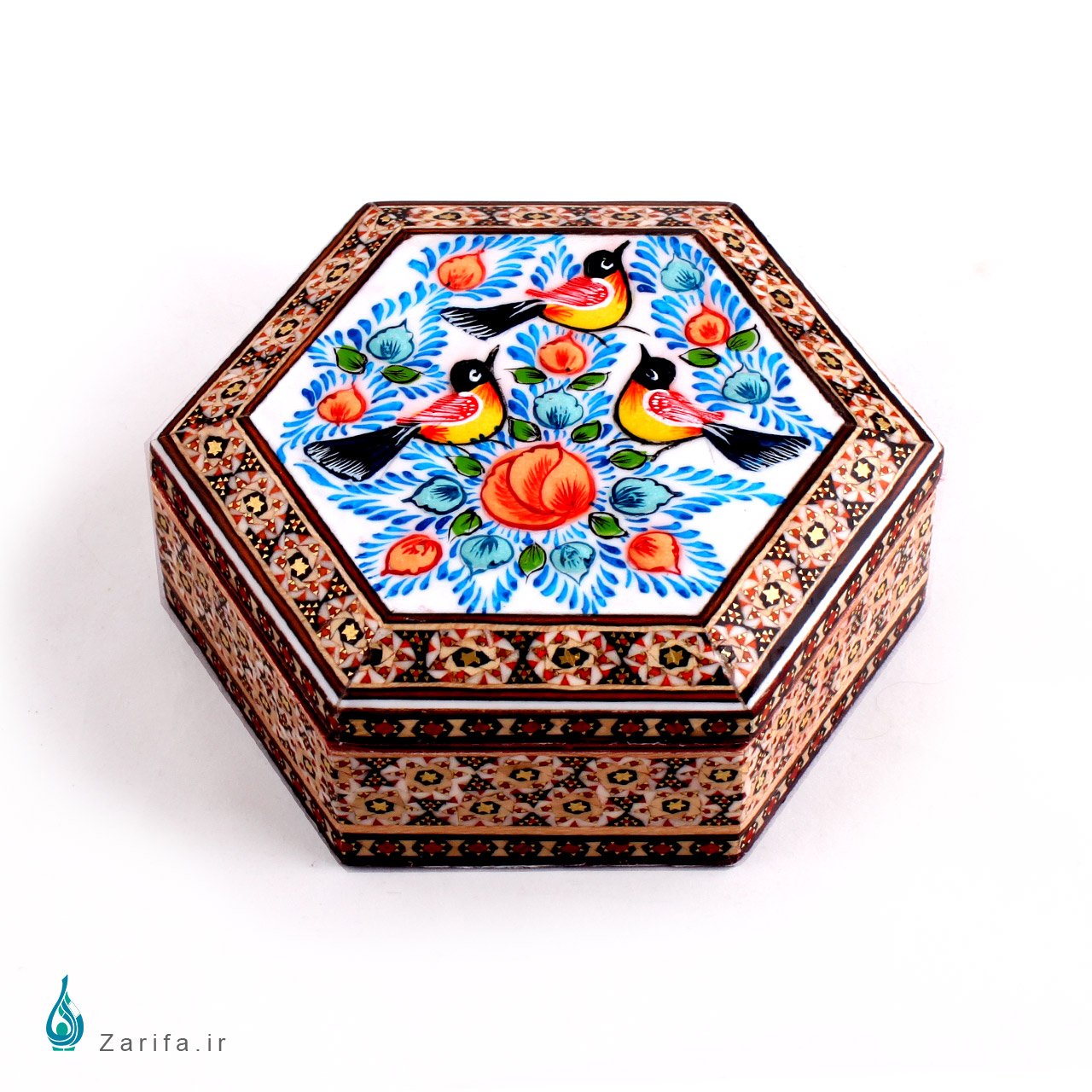 معرفی و اطلاعات کلی جعبه جواهرات خاتم 6 ضلعی کوچک با نقاشی گل و مرغ