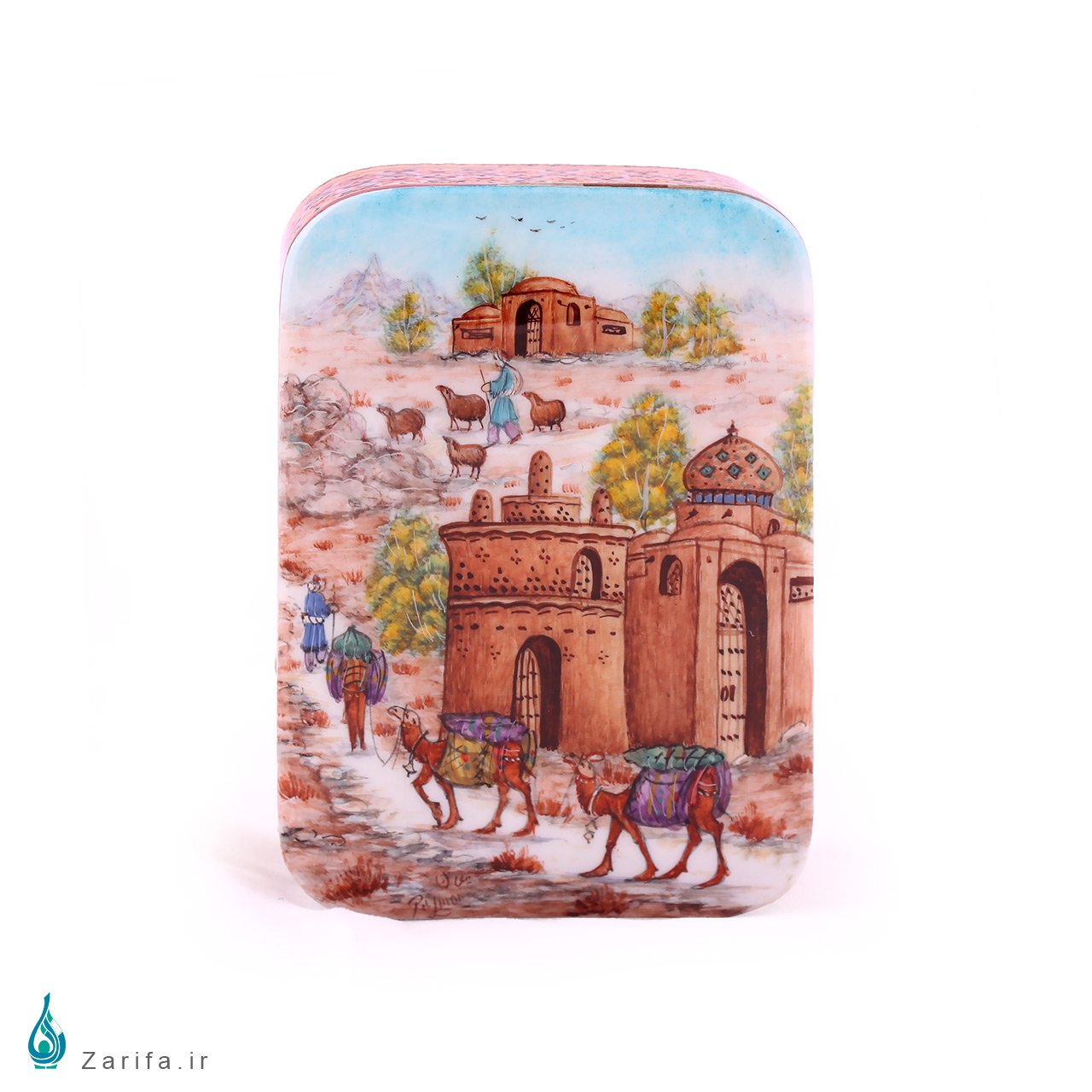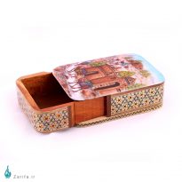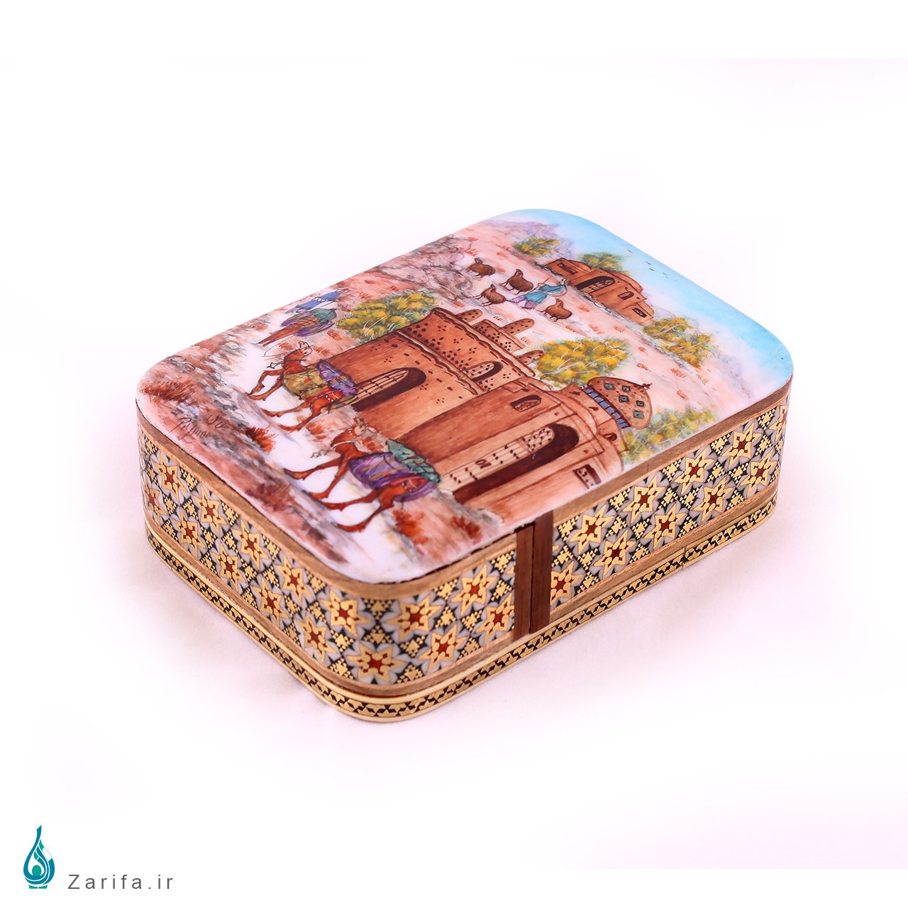 خانم ها معمولا از داشتن طلا و جواهرات لذت می برند. اما نمی توانند تمامی جواهرات را با خود به همراه داشت. در ضمن کادو دادن طلا و جواهرات، گاه حتی گردن آویزها و دست بند های نقره و استیل و سایر زیور آلات به بسته بندی متناسب با خود انها نیاز دارد. چه بهتر که این مهم در جعبه ای از صنایع دستی سرزمین خودمان انجام شود. بر روی جعبه خاتم با نگارگری منظره روستایی، نقاشی زیبایی وجود دارد که بسیار استادانه و خوش پرداخت است و می تواند محملی زیبای برای زیور آلات باشد. همچنان که به خودی خود بر روی میز آرایش یا به عنوان جعبه کادو، اثری است زیبا و منحصر به فرد.