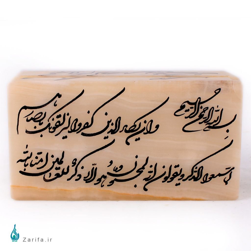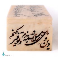 خطوط طبیعی سنگ مرمر به عنوان پشت زمینه این خط زیبا یک آرایش زیبا برای خط است و خط شکسته که با سلیقه ایرانی هماهنگ است این جعبه را به یک هدیه بسیار زیبا و لطیف تبدیل کرده است. ترکیب آیه قرآن با اشعار زیبای پارسی، دامنه مختلف سلیقه ها را برای لذت بردن از این اثر راضی می کند.