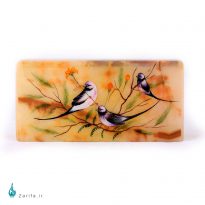 جعبه ای ساخته شده از سنگ و پر از نقاشی های ظریف و شاعرانه سه پرنده با ترکیب رنگ بسیار لطیف و دلپذیر،