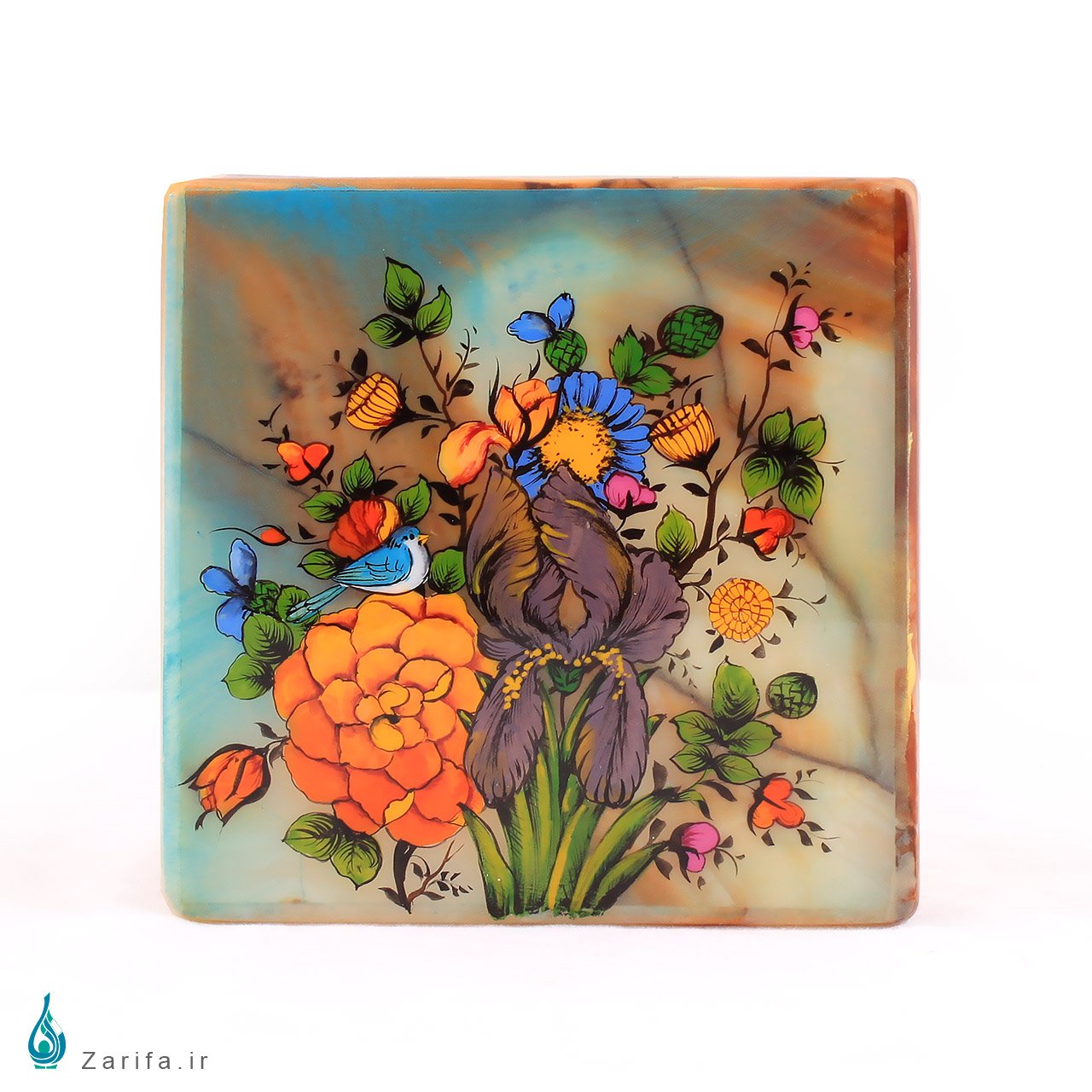 جعبه مربع سنگ مرمر با نگارگری گل و مرغ اسکندری 10*10