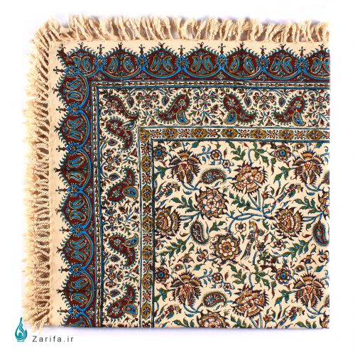 این رومیزی مربع شکل را استاد جعفری از پیشکسوتان هنر قلمکاری ارائه کرده است. با توجه به اندازهای که این سفرهی قلمکار دارد، میتوان از آن برای روی میزهای عسلی استفاده کرد .