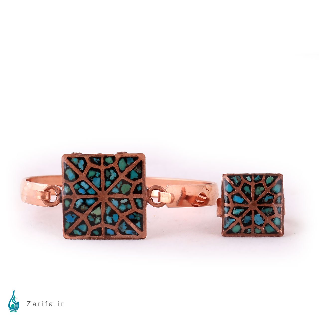 ست انگشتر و دستبند فیروزه و مس شبکه مربع