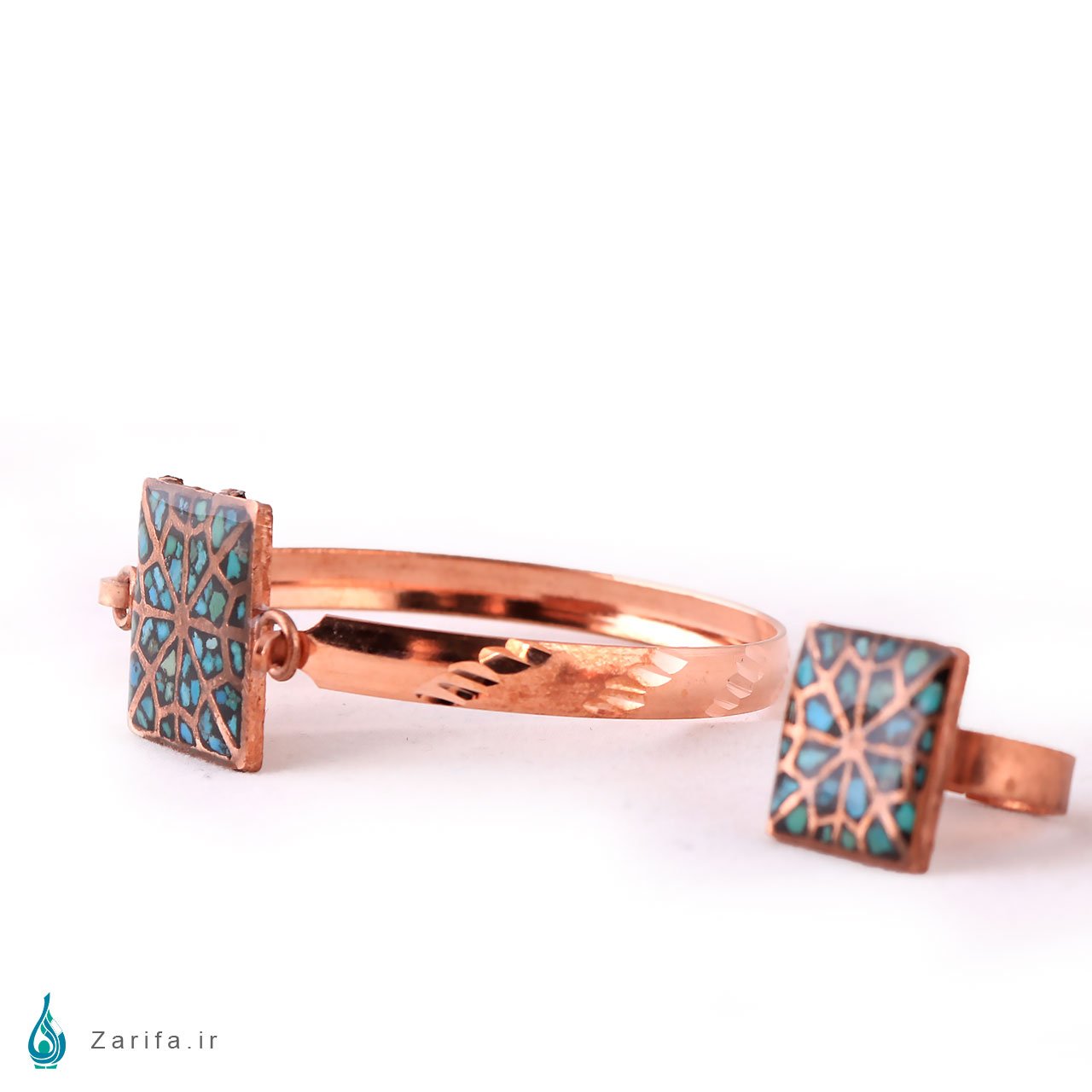 این دست بند و انگشتر از شبکه بندی بر روی مس و فیروزه حاصل شده و مدل شبکه بندی مربعی آن ، زیبای دو چندان به آن بخشیده است