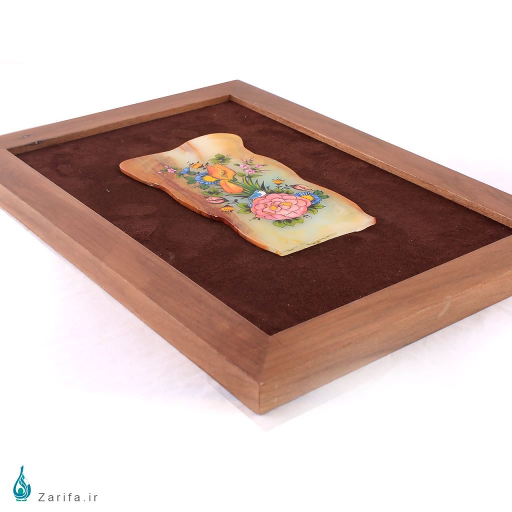 حال و هوای عرفانی و زیبایی و ملاحت نقاشی گل و مرغ از ویژگی های زیبای قاب سنگ مرمر با نگارگری گل و مرغ است که از نقش و نگار طبیعی سنگ در کنار زیبایی هنر نگارگری بهره مند است.