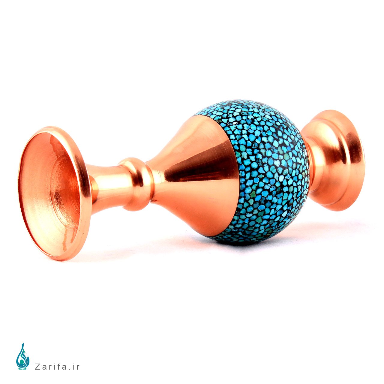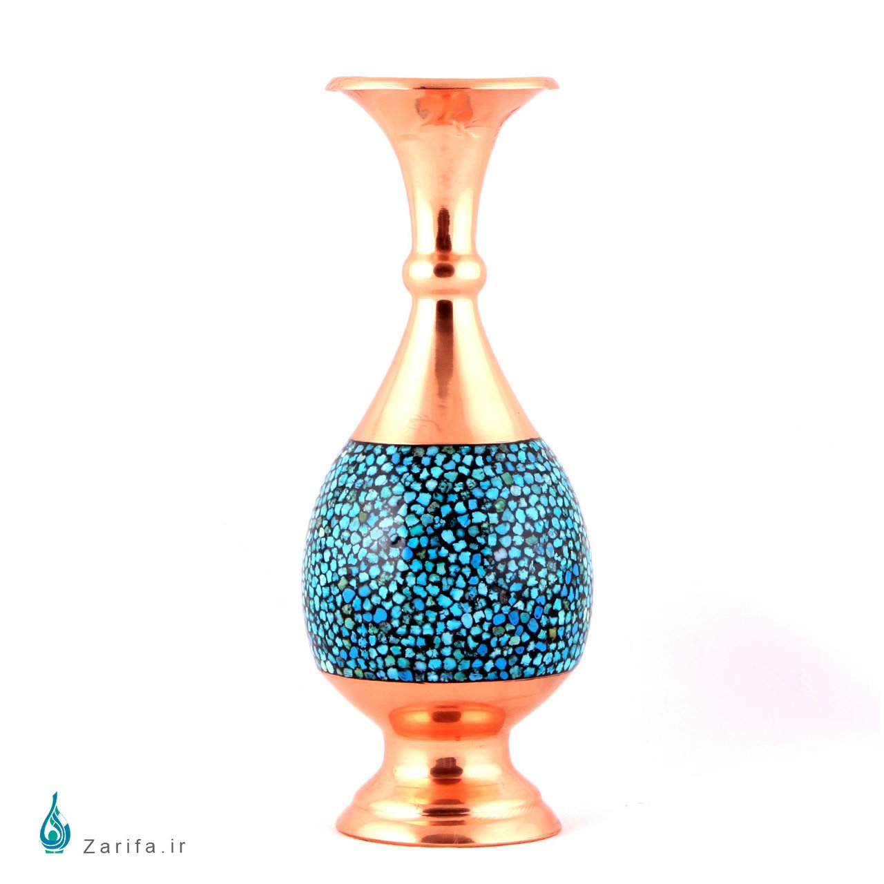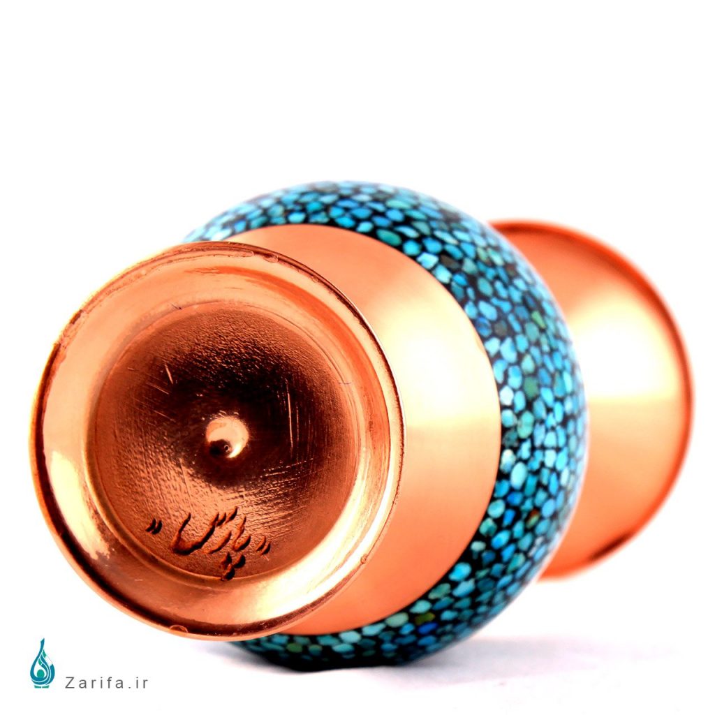یک گلدان فیروزه کوب مسی صراحی هر بیننده ای را می نوازد. طول گلدان فیروزه کاری شده 25سانتی متر است و با توجه به مراحل دقیق ساخت آن، از استحکام زیادی برخوردار است. هم چنین شکل این گلدان زیبایی و انحنای متمایزی دارد.گلدان های صراحی، از طراحی بسیار متناسبی برخوردار اند.
