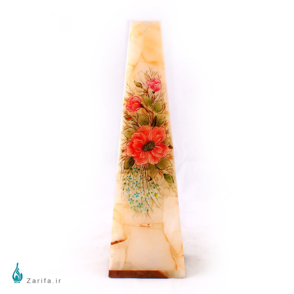 حال و هوای عرفانی و زیبایی و رنگ های زنده نگارگریکه با سلیقه انتخاب شده از ویژگی های زیبای گلدانی است که از نقش و نگار طبیعی سنگ در کنار زیبایی هنر نگارگری بهره مند است. زیبایی این گلدان به تنهایی به اندازه ای سات که حتی بدون گل هم زیباست خطوط اسلیمی کار شده بر روی بدنه ها، موجب می شود هر وجه بتواند زیبایی در خور و شایسته خویش را بیابد. همچنان که عبور نور از برش ظریف سنگ زیبایی آن را دو چندان می کند.